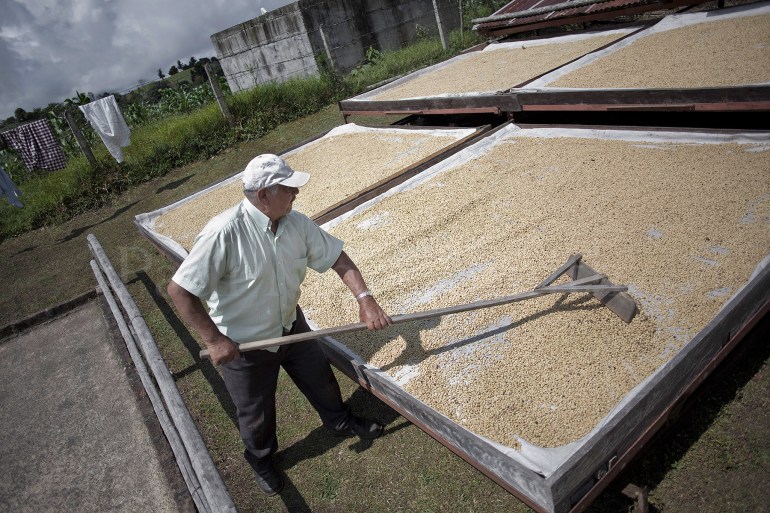 Timbío, Cauca – Luis Garzón (80) a coffee farmer in the Cauca region of Colombia has experienced deceased coffee yields and lower quality because of rising temperatures and more intense and unpredictable rains in the region. Colombia is known for its excellent Arabica coffee variety but growers are increasingly changing to the more rust resistant Castillo variety, which better resists the pests and fungi whose spread has been encouraged by the warmer and damper climate, party brought on by global warming.