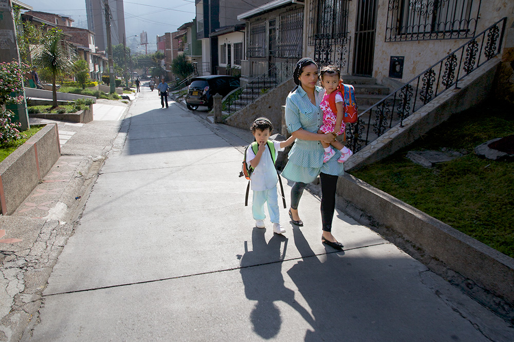 Galit Zapata takes her 4-year-old son, Baruj, to kindergarten, accompanied by her 2-year-old daughter, Gabriela.