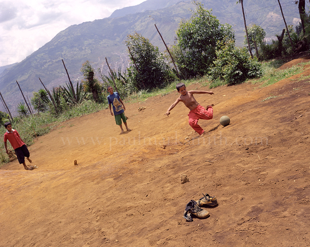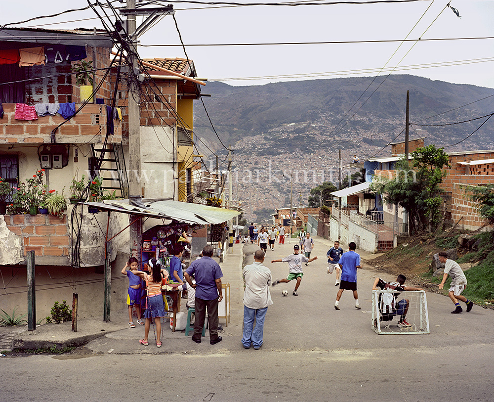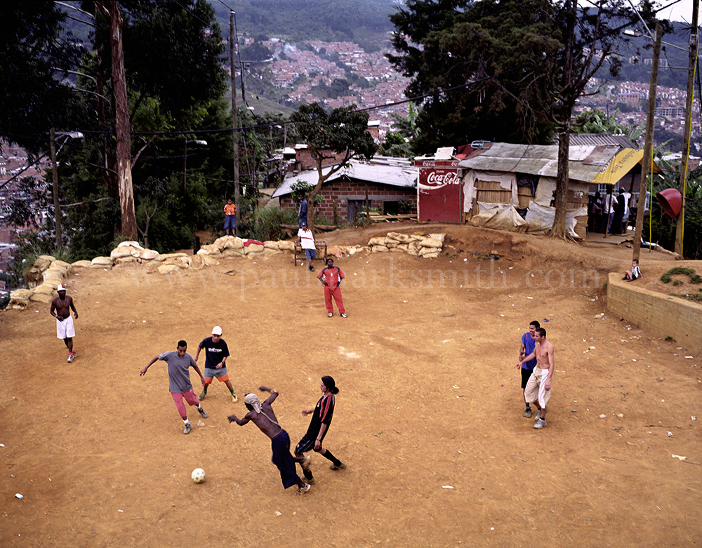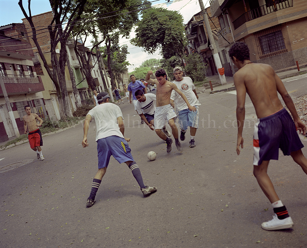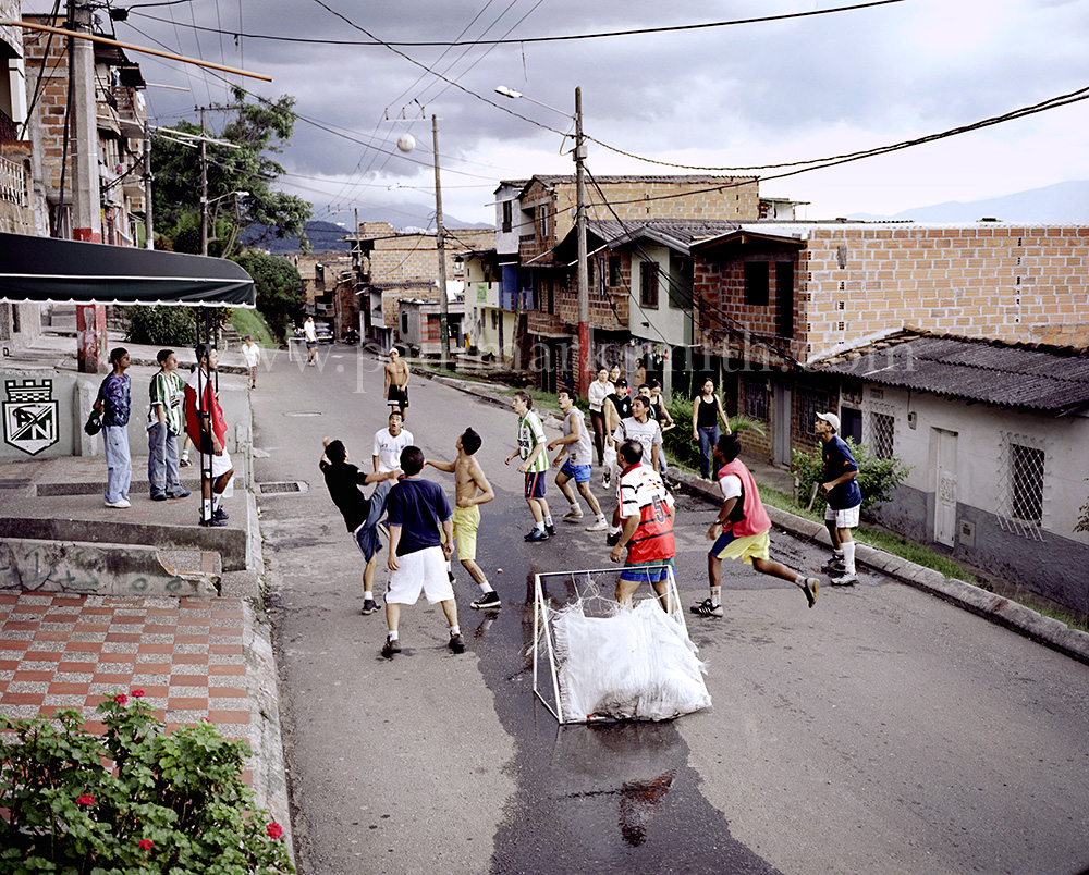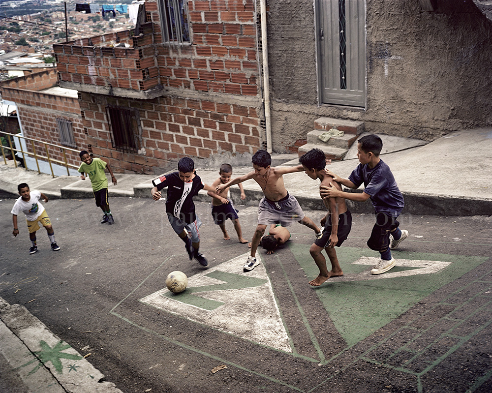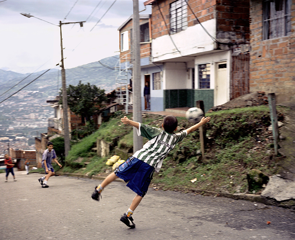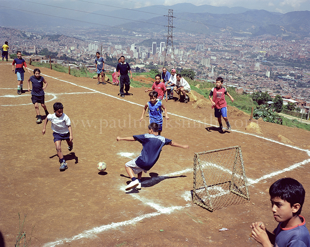 Latin American societies are amongst the most inequitable on the face of the earth. And in that sorry league, Colombia is one of the worst. In Medellín and the Aburrá Valley, where these photographs were taken, the stigma of living in a poor barrio will restrict your chances of personal advancement and ensure that there are far more obstacles to getting on in life than for those living in the wealthier neighbours. The metaphor of “a level field”, which refers to being able to compete on equal terms, becomes deeply ironic on the street football pitches of the Aburrá Valley, as it is on those inclines that the poorer youths will be able to compete with less disadvantages than those they will encounter in life beyond the confines of the beautiful game in pursuit of a ball.