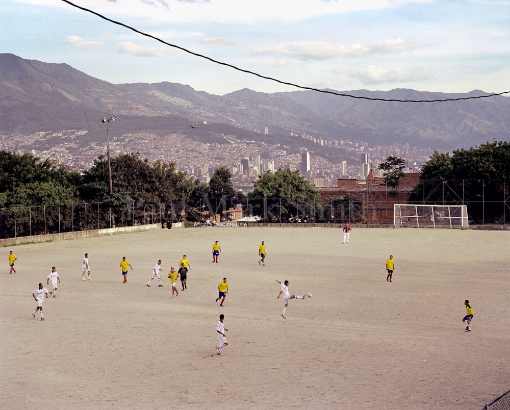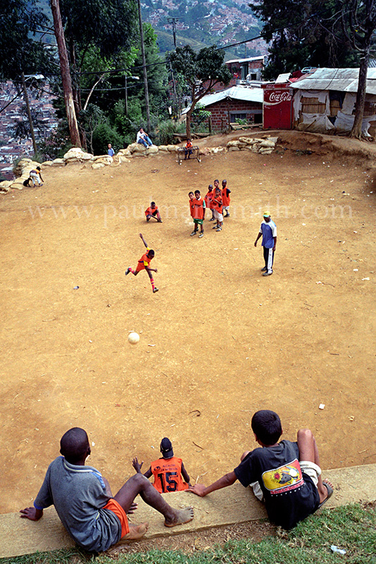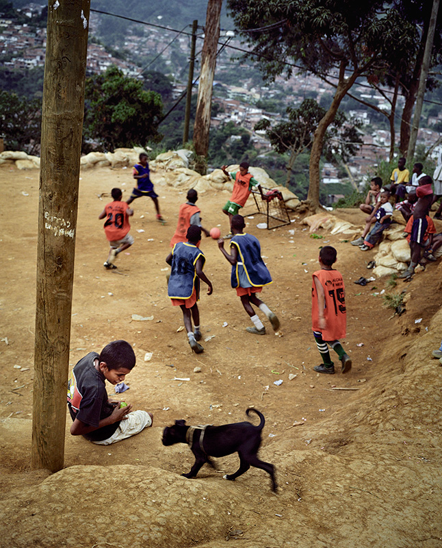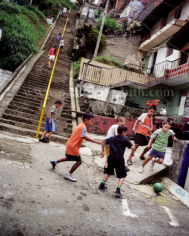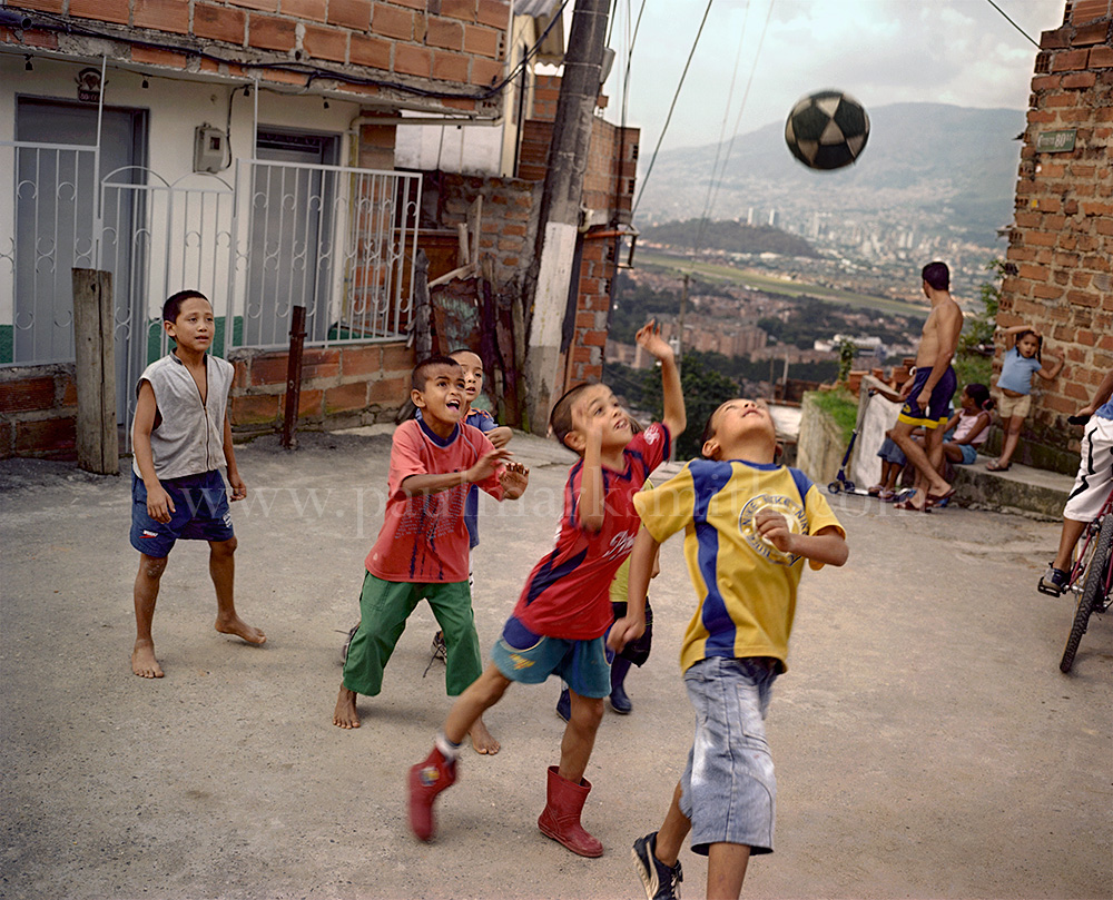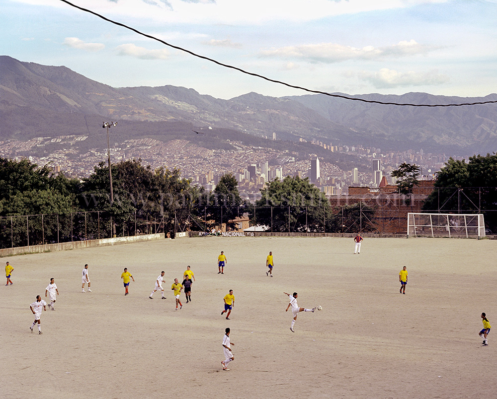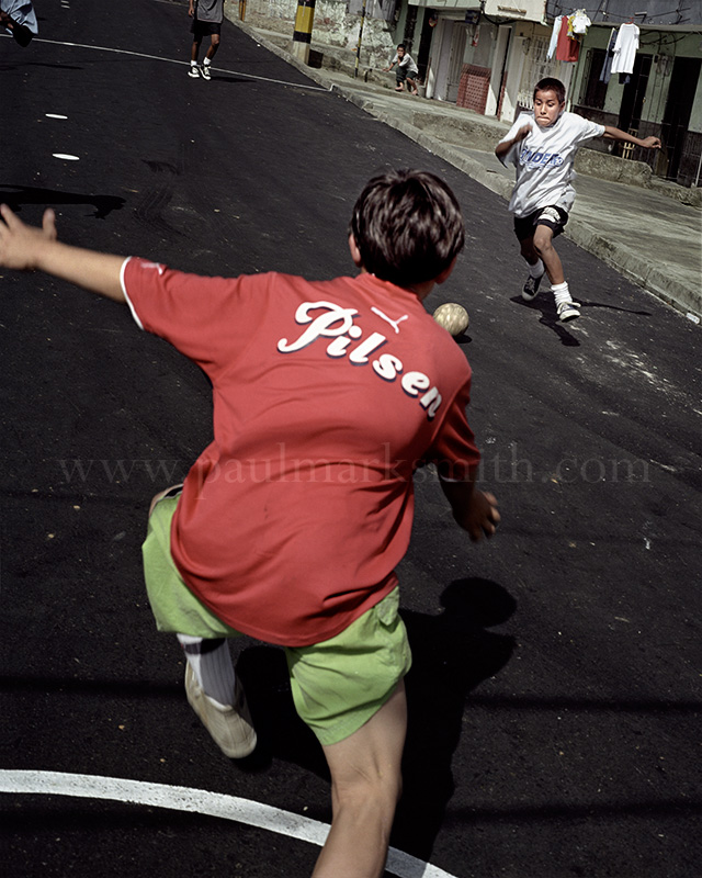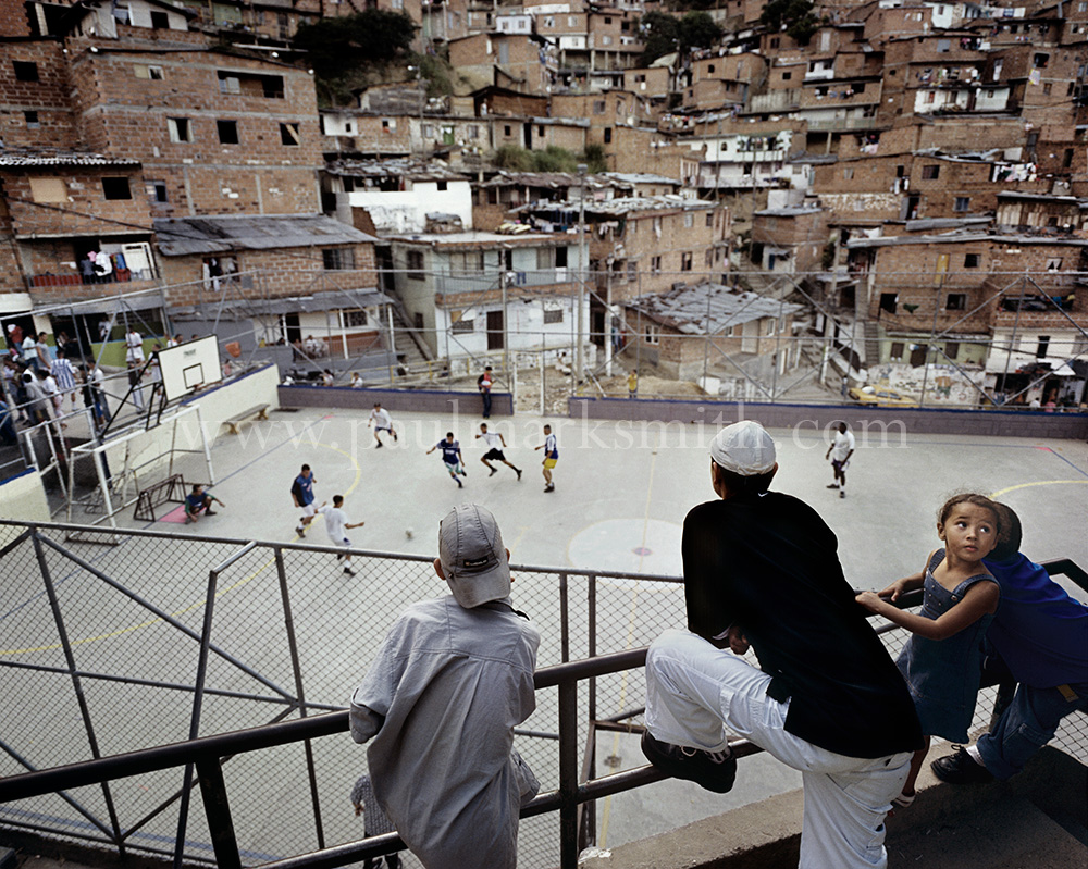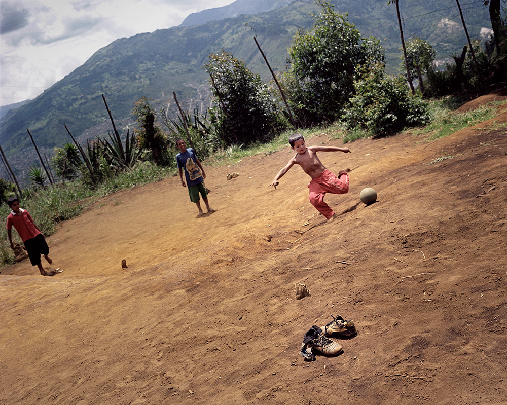 Latin American societies are amongst the most inequitable on the face of the earth. And in that sorry league, Colombia is one of the worst. In Medellín and the Aburrá Valley, where these photographs were taken, the stigma of living in a poor barrio will restrict your chances of personal advancement and ensure that there are far more obstacles to getting on in life than for those living in the wealthier neighbours. The metaphor of “a level field”, which refers to being able to compete on equal terms, becomes deeply ironic on the street football pitches of the Aburrá Valley, as it is on those inclines that the poorer youths will be able to compete with less disadvantages than those they will encounter in life beyond the confines of the beautiful game in pursuit of a ball.