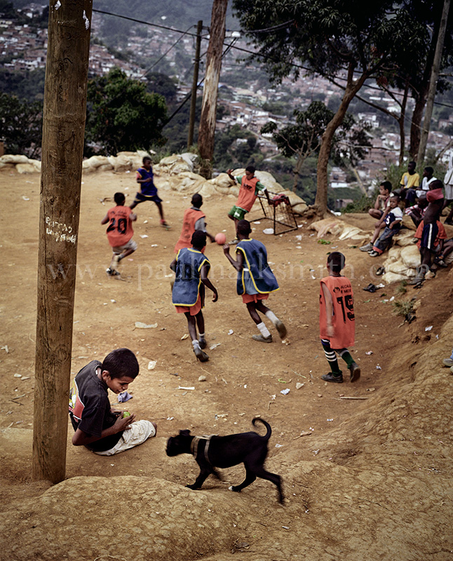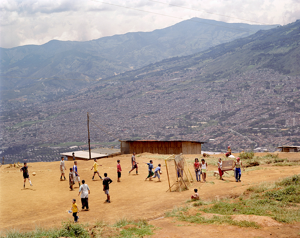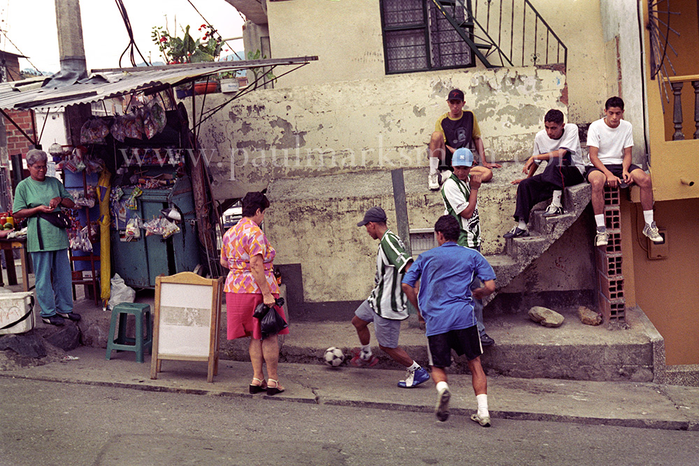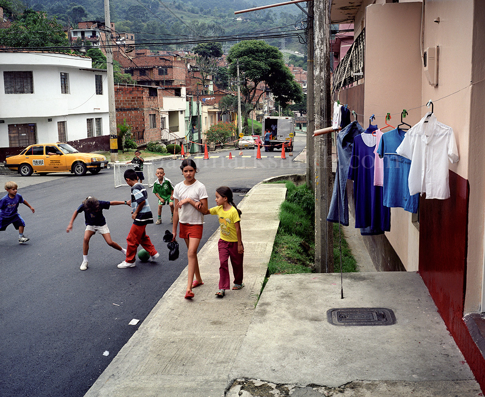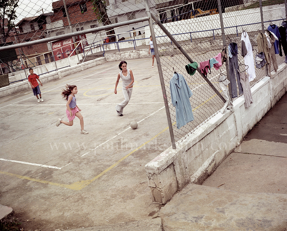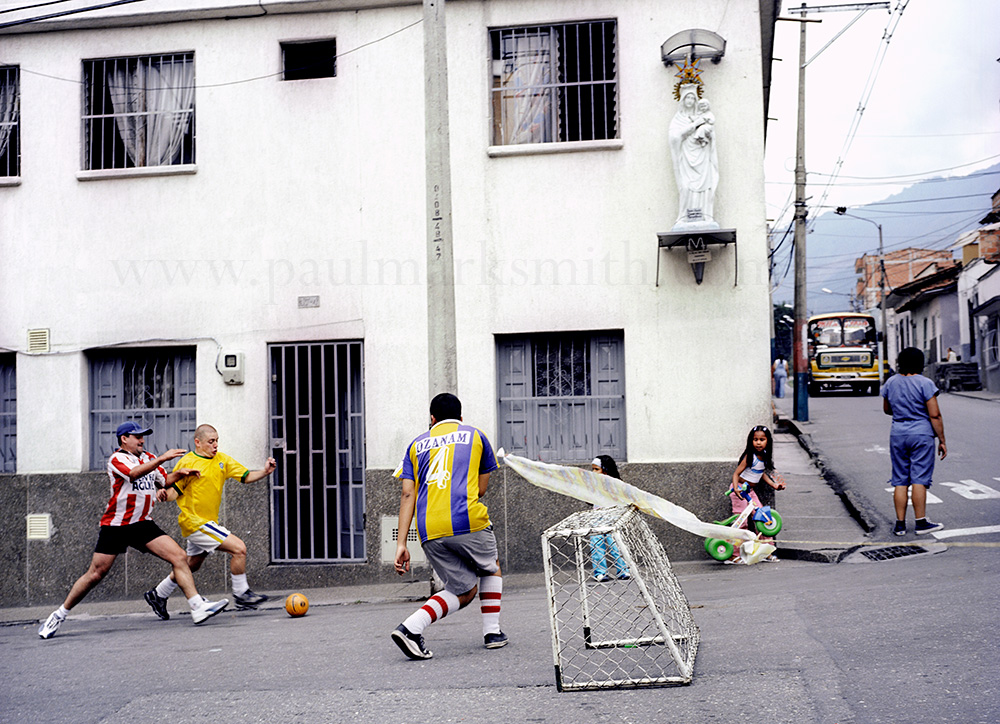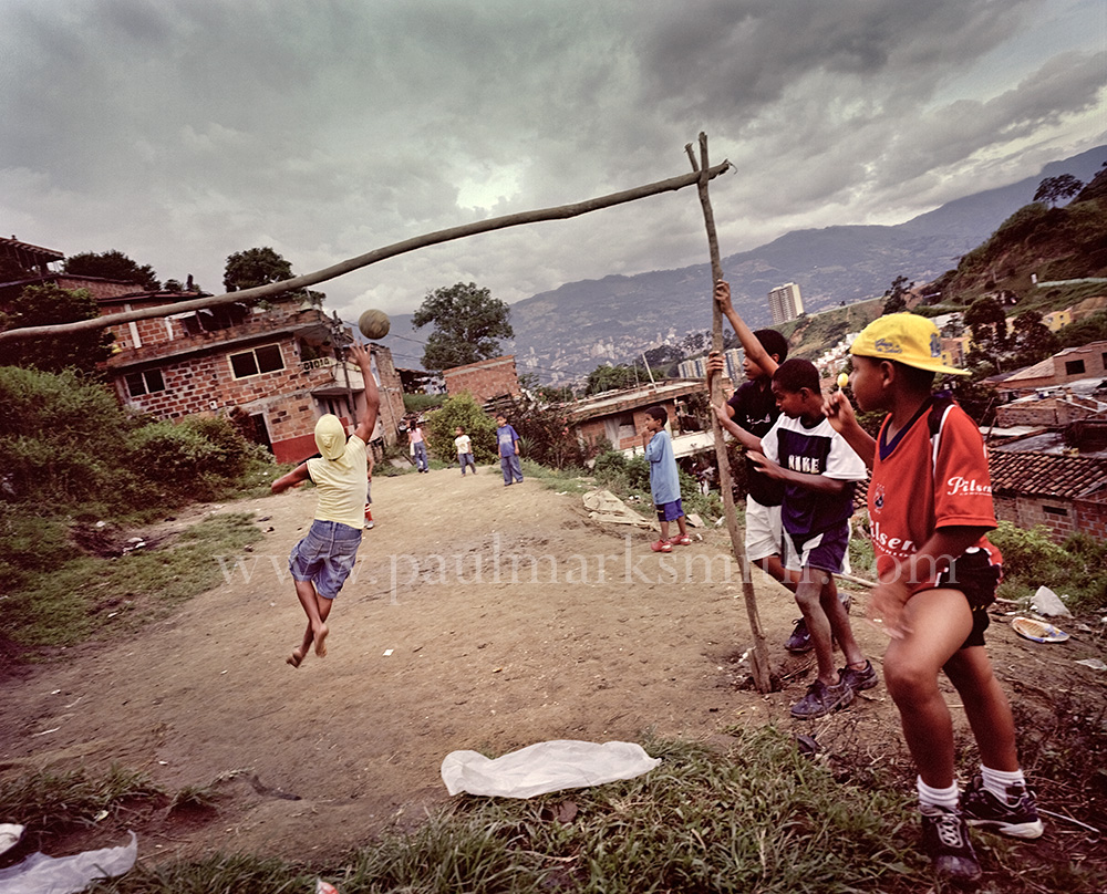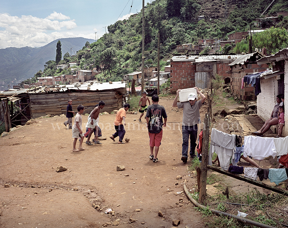 Latin American societies are amongst the most inequitable on the face of the earth. And in that sorry league, Colombia is one of the worst. In Medellín and the Aburrá Valley, where these photographs were taken, the stigma of living in a poor barrio will restrict your chances of personal advancement and ensure that there are far more obstacles to getting on in life than for those living in the wealthier neighbours. The metaphor of “a level field”, which refers to being able to compete on equal terms, becomes deeply ironic on the street football pitches of the Aburrá Valley, as it is on those inclines that the poorer youths will be able to compete with less disadvantages than those they will encounter in life beyond the confines of the beautiful game in pursuit of a ball.