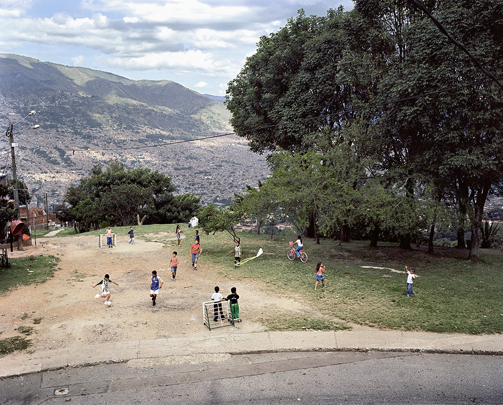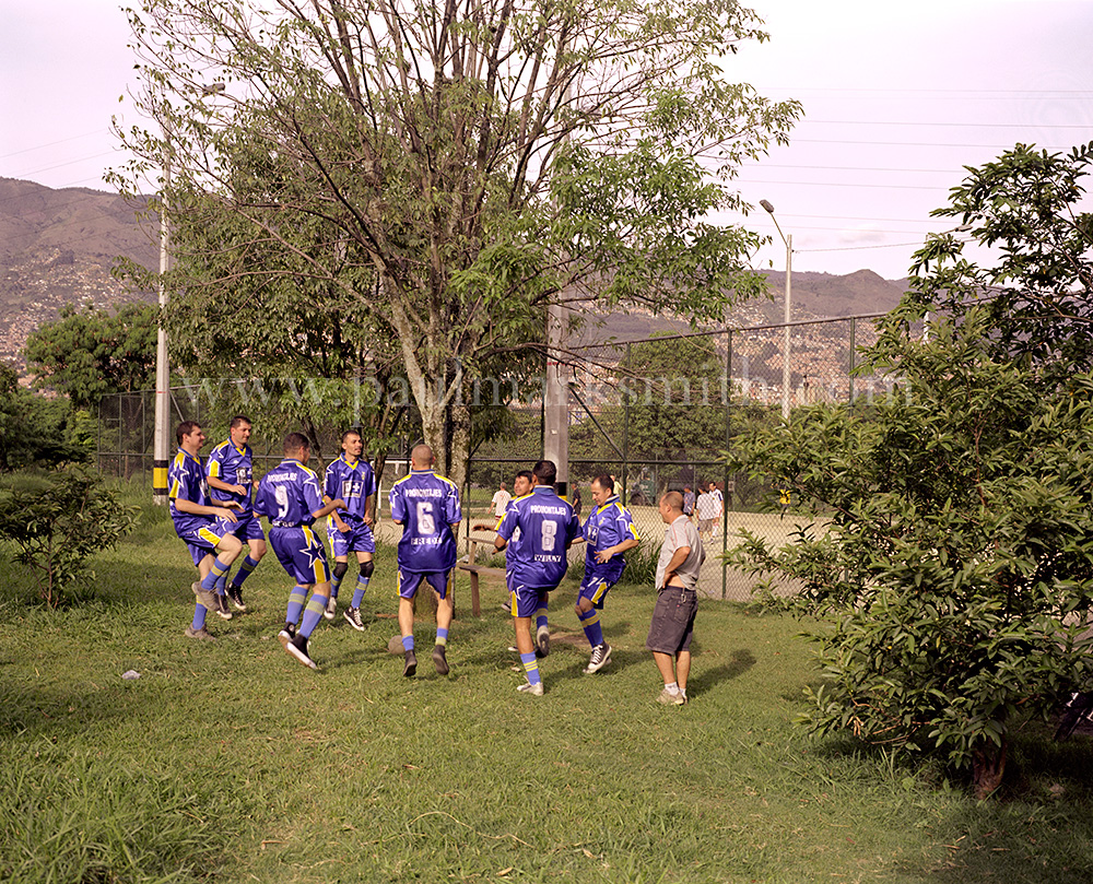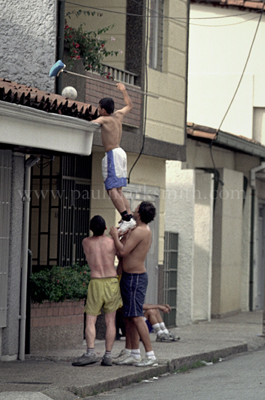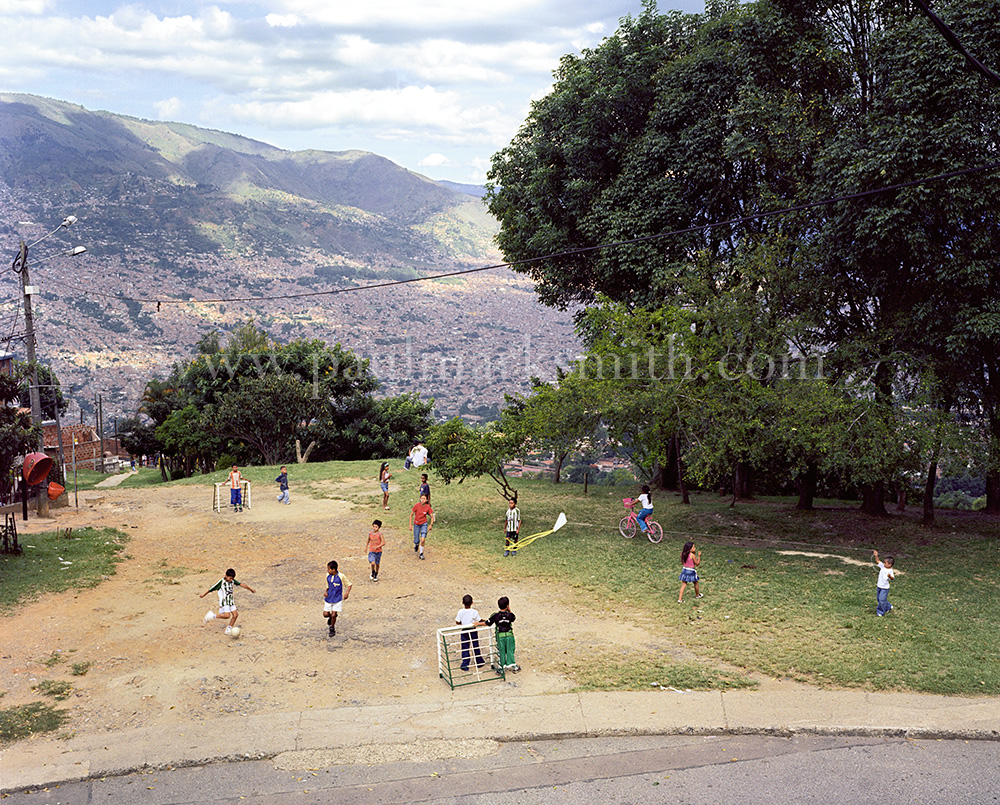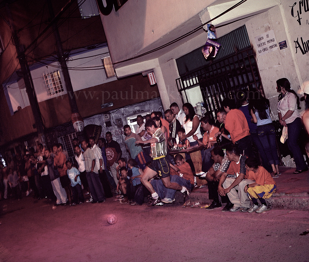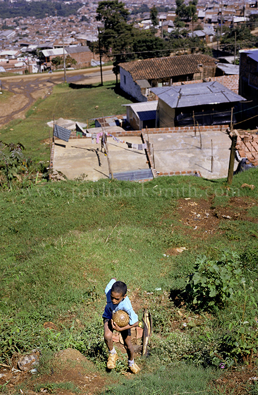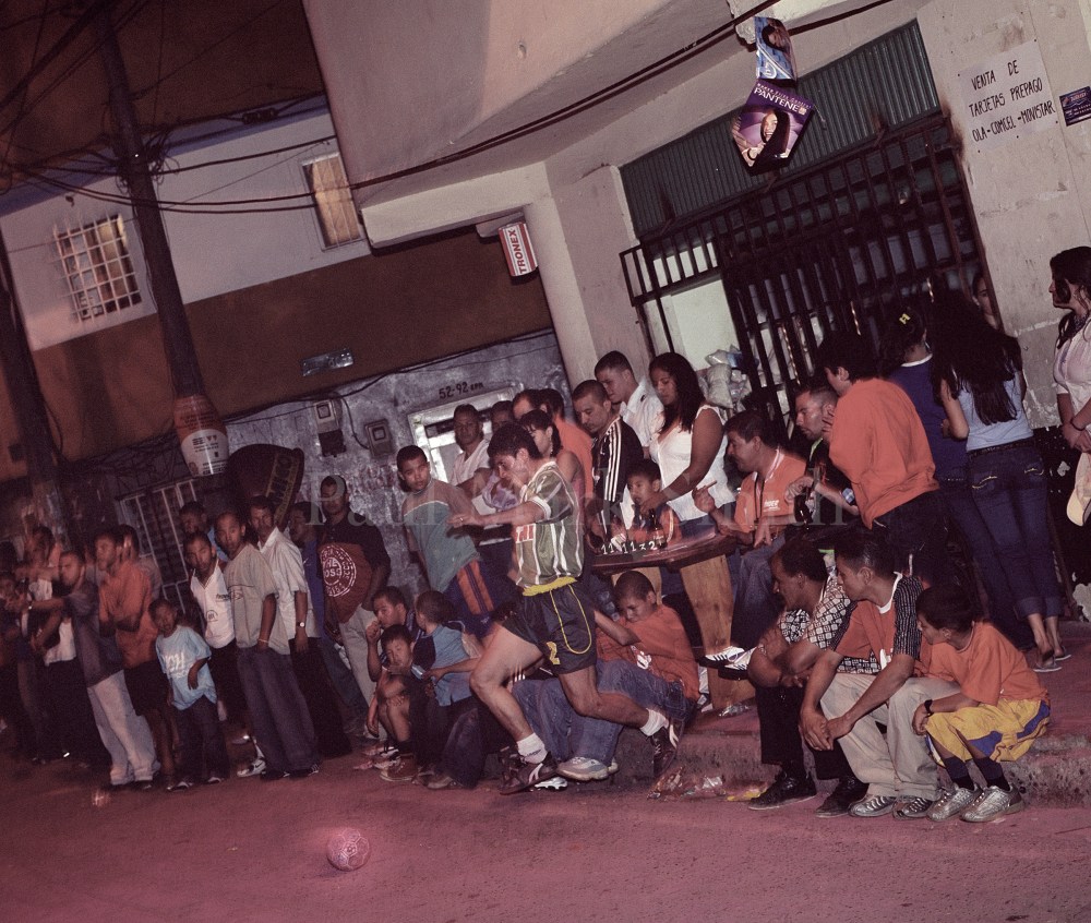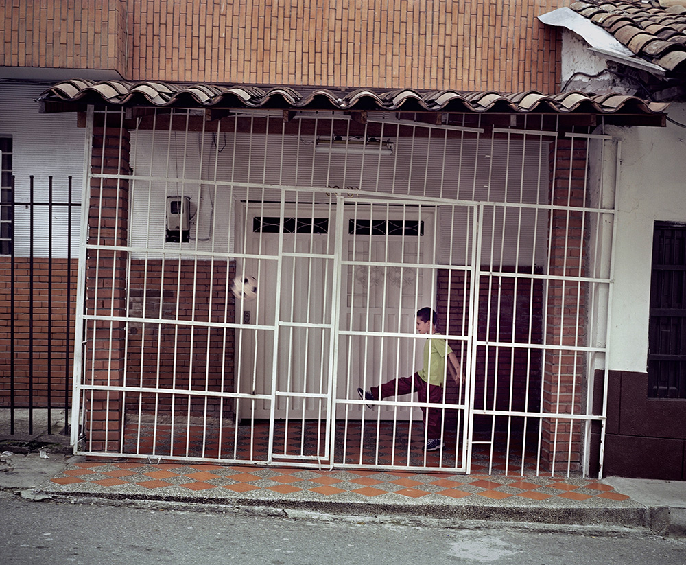 Latin American societies are amongst the most inequitable on the face of the earth. And in that sorry league, Colombia is one of the worst. In Medellín and the Aburrá Valley, where these photographs were taken, the stigma of living in a poor barrio will restrict your chances of personal advancement and ensure that there are far more obstacles to getting on in life than for those living in the wealthier neighbours. The metaphor of “a level field”, which refers to being able to compete on equal terms, becomes deeply ironic on the street football pitches of the Aburrá Valley, as it is on those inclines that the poorer youths will be able to compete with less disadvantages than those they will encounter in life beyond the confines of the beautiful game in pursuit of a ball.