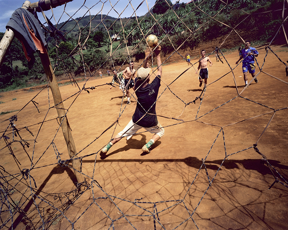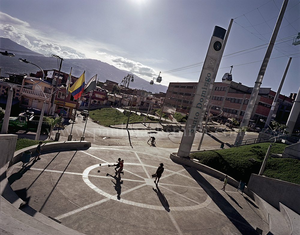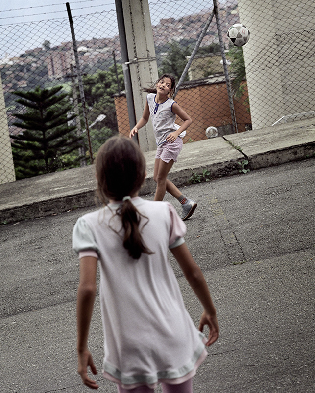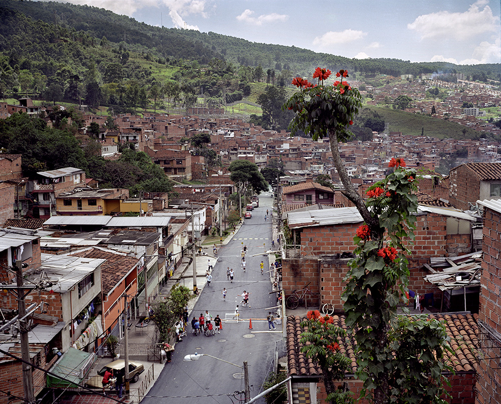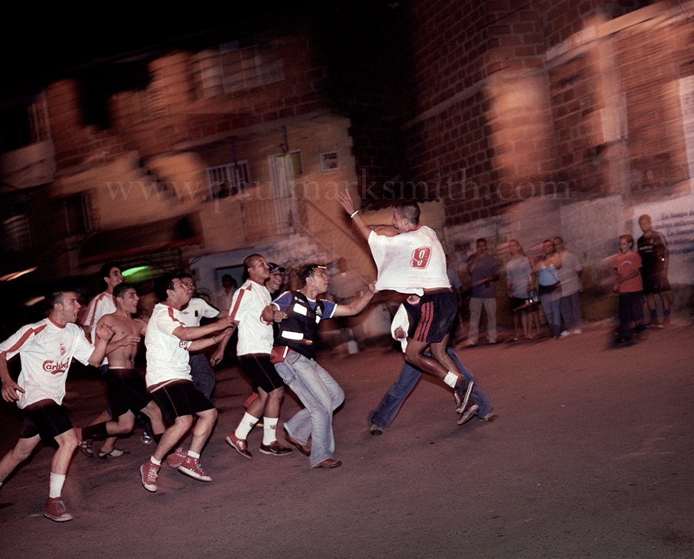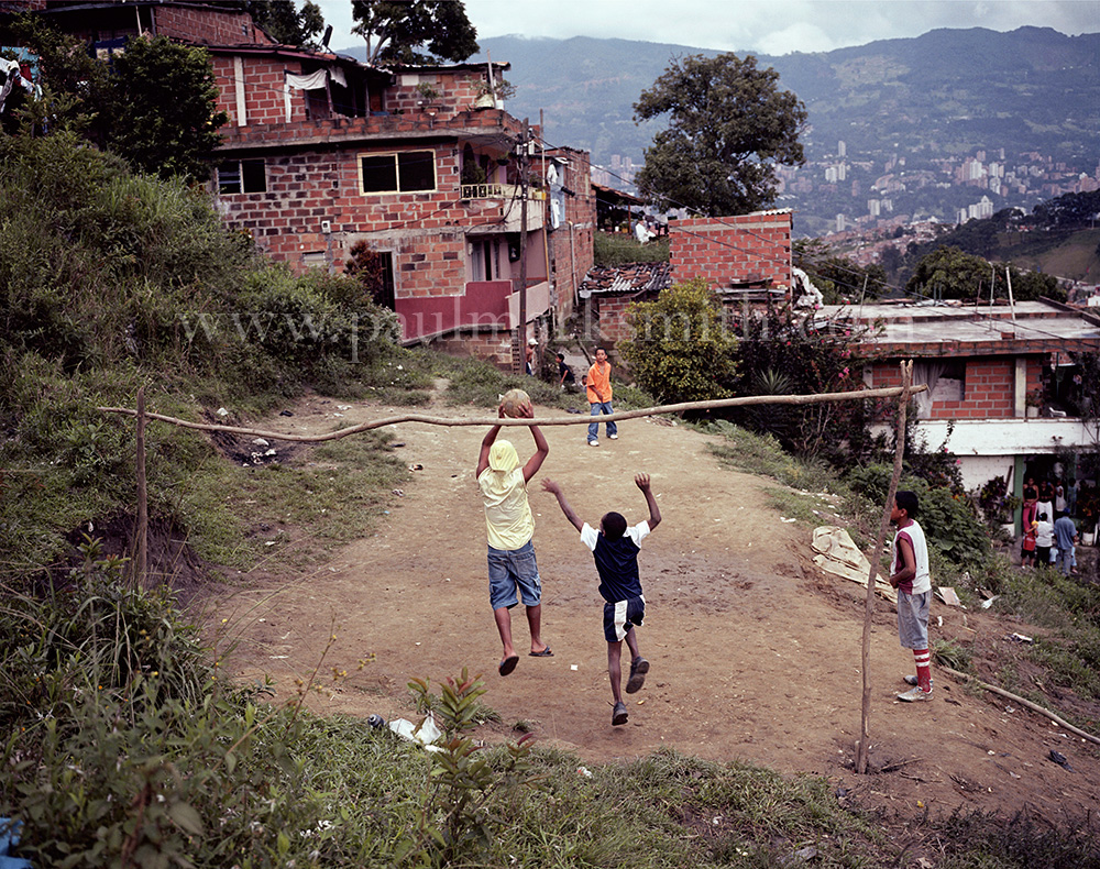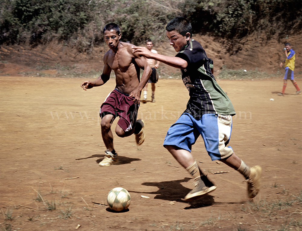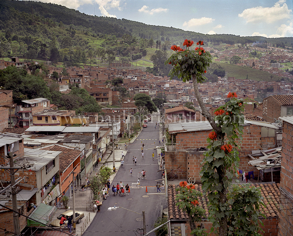Latin American societies are amongst the most inequitable on the face of the earth. And in that sorry league, Colombia is one of the worst. In Medellín and the Aburrá Valley, where these photographs were taken, the stigma of living in a poor barrio will restrict your chances of personal advancement and ensure that there are far more obstacles to getting on in life than for those living in the wealthier neighbours. The metaphor of “a level field”, which refers to being able to compete on equal terms, becomes deeply ironic on the street football pitches of the Aburrá Valley, as it is on those inclines that the poorer youths will be able to compete with less disadvantages than those they will encounter in life beyond the confines of the beautiful game in pursuit of a ball.
