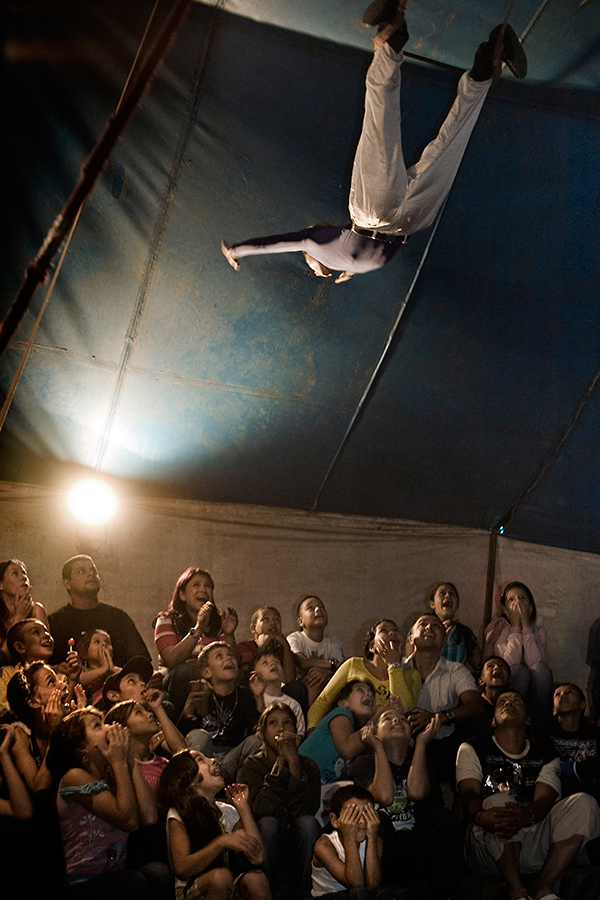 I returned to the Titanic to talk to Crispetas and ask to photograph a performance. Crispetas was an affable man. He introduced me to some of the performers. Fire spitting, glass eating Gilberto was a quiet man in his forties with a big belly. He had come across the circus when it came to his barrio and when it left, he left with it. The aerial ballet dancer, María, was also a contortionist, as were her four young daughters who were born of four different fathers. The slim and sanguine María had fled from the armed conflict in Urabá on the Caribbean Coast, where civilians of humble origins were the principal victims of the territorial control exercised by the Colombian Army and their right-wing paramilitary cousins. In the circus, she and her kids had found a home and a modest income.