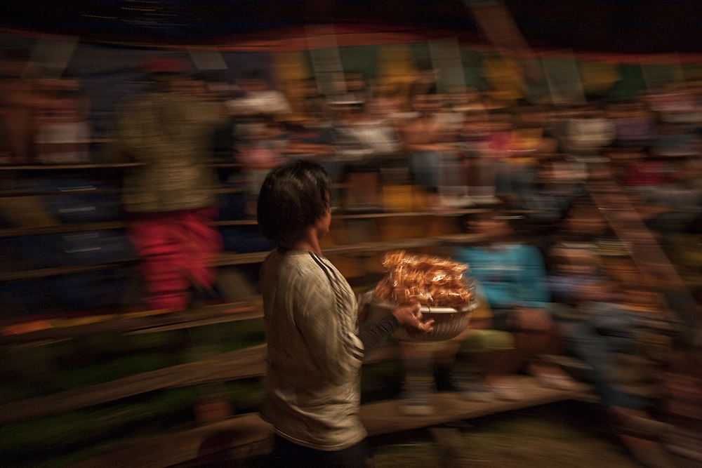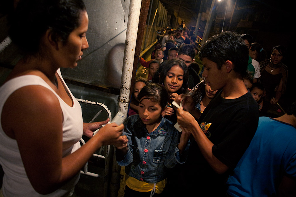 (Above) As a communal event within the neighbourhood, the circus offers a opportunity to come together, see and be seen. Here, an adolescent girl exchanges glances with a boy during the interval while both snack on mango biche – a bitter green mango served with lime and salt.