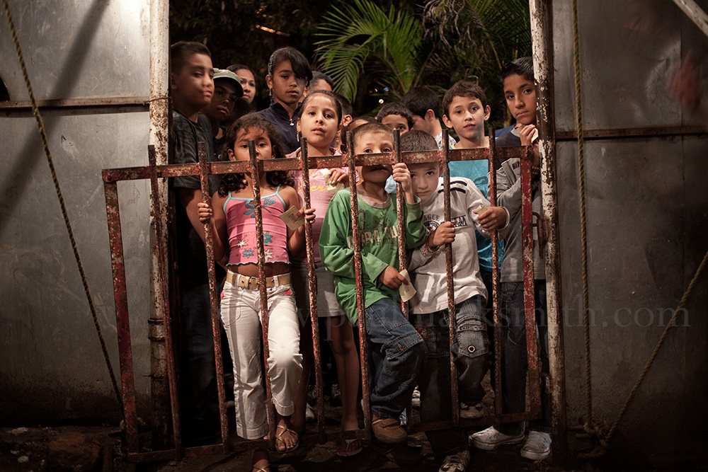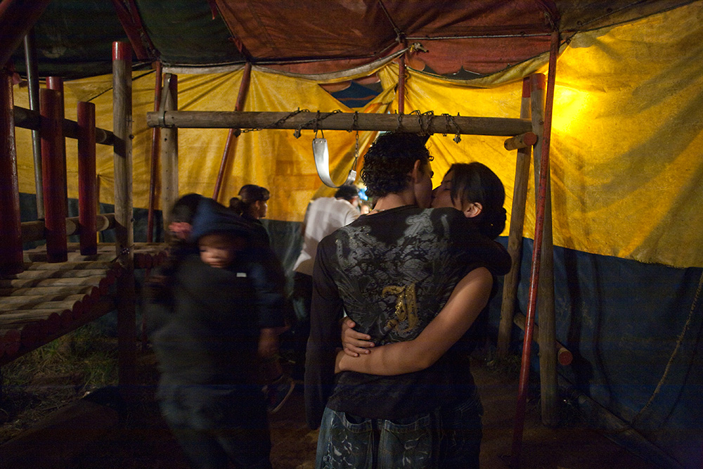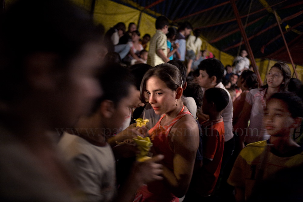 Mario offered me a Rimax and he sat in the other. His wife, Elizabeth, folded clothes and his two youngest daughters, Vanesa (4) and Yesica (2) buried under the blankets on the large bed. The three boys were there too, though they slept in another camarin. They were called the Golden Boys – Los Niños de Oro. The Jhon Danyer circus was named after the three of them: Jhon Estiven (13), Daniel (11) and Yerferson (8). The two eldest were pretty much the backbone of the business. They performed high wire, trapeze, balancing acts and juggling. There was a fierce sibling rivalry between them, driven mostly by Daniel. The youngest did clowning with them and also contortion. For him, the performing was play.
