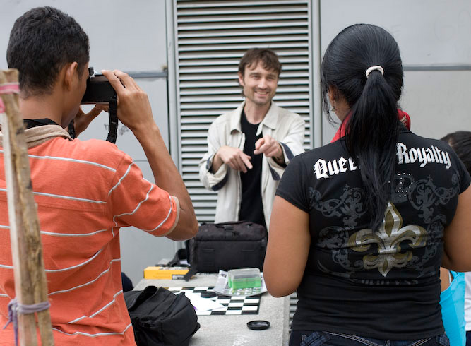 On the street during the first workshop with students from Fe and Alegria school in the Moravia/El Bosque district. Here we familiarise the students with the cameras before starting to photograph the same afternoon.