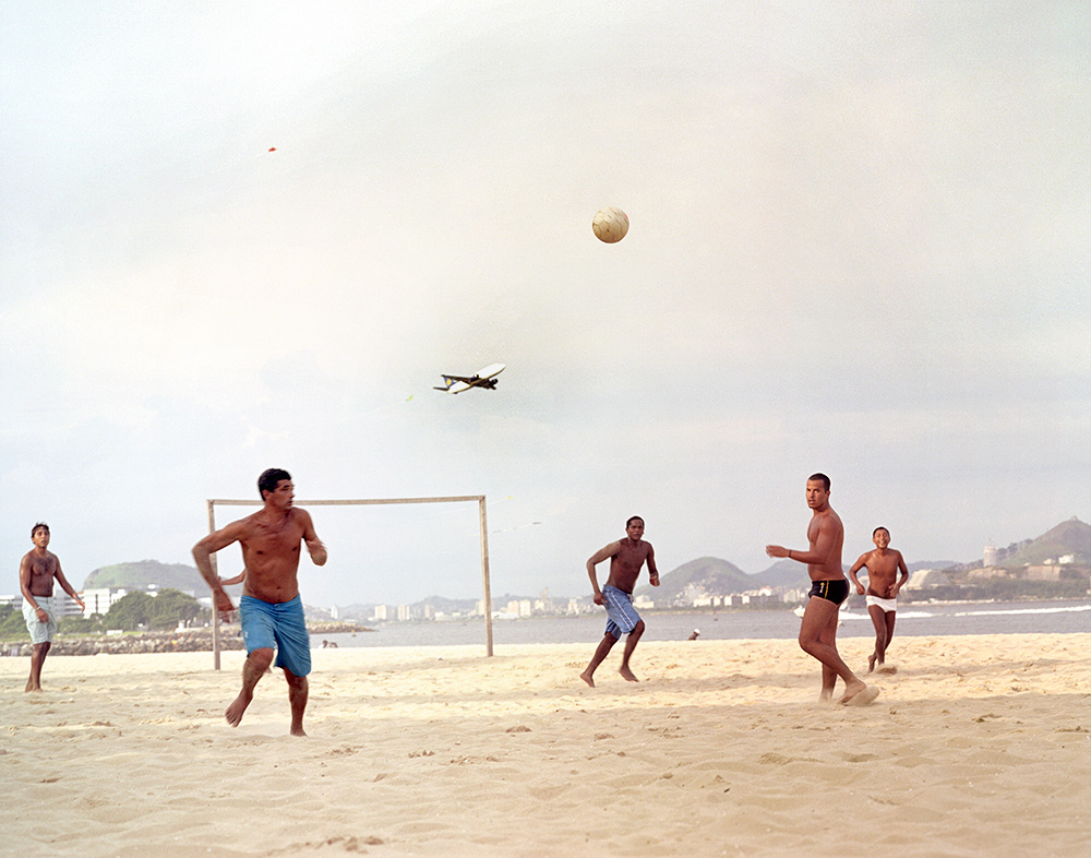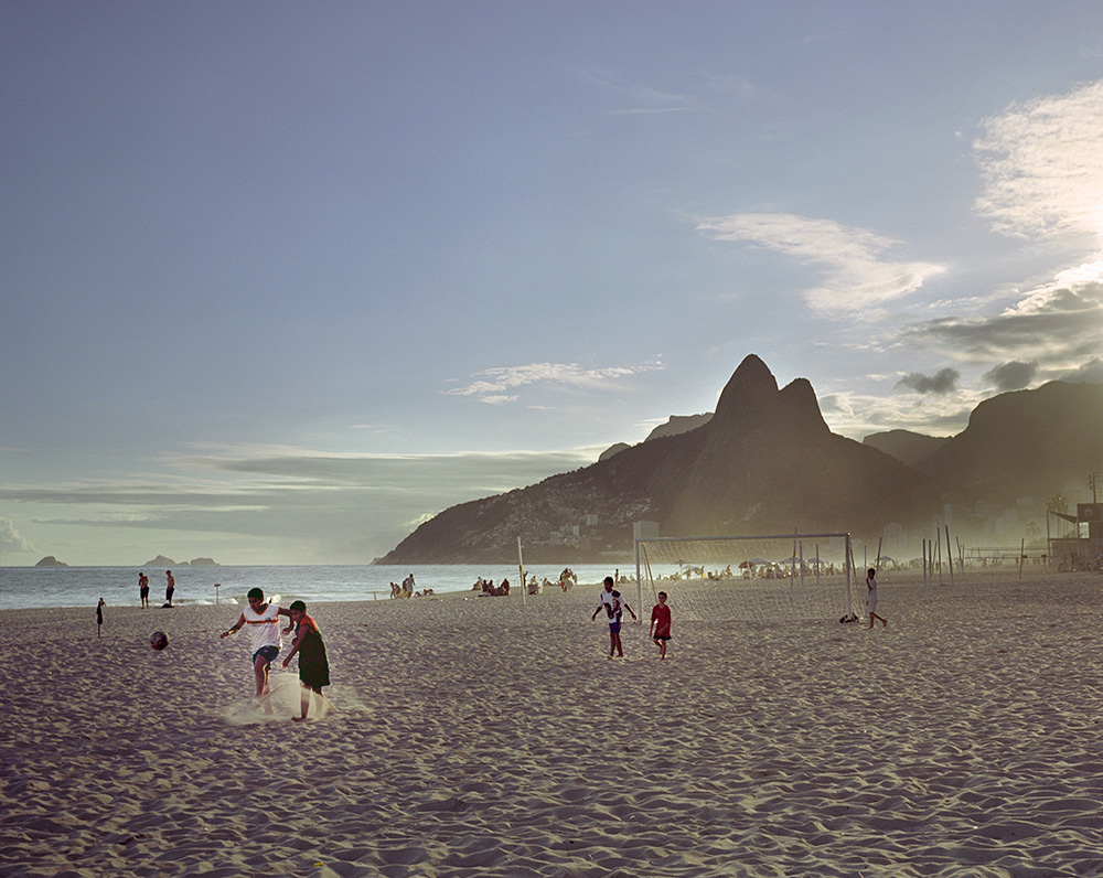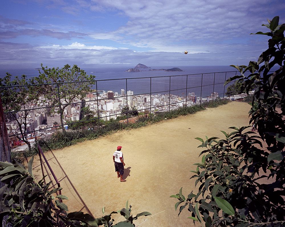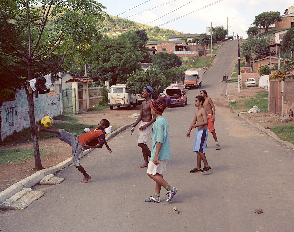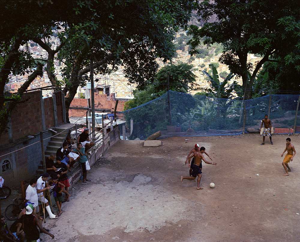 Porto Alegre, Brazil – (Above) The football coach on the pitch where Ronaldinho played as a boy shows photos of football in Medellín – the booklet I made to show The Dream Factory project to people as I travelled and visited the favelas and barrios of Argentina, Paraguay and Brazil. (Below) Youths look at The Dream Factory booklets in the Rocinha favela as others play football.
