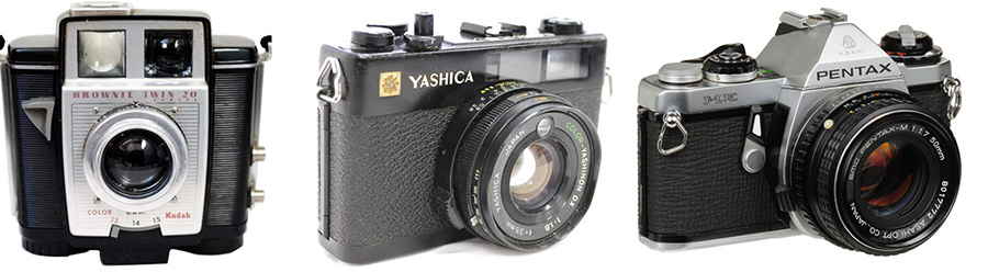 The first cameras: Kodak Brownie Twin 20; Yashica Electro 35 CCN; Pentax ME Super.